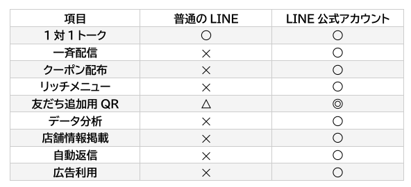 同じLINEでも「LINE公式アカウント」と個人が使う普通のLINEでは、できることに下記のような大きな違いがあります。